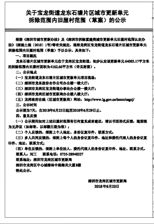 龍東石塘片區(qū)舊改:該項(xiàng)目于2018年4月18日《2018年龍崗區(qū)城市更新單元計(jì)劃第三批計(jì)劃》批準(zhǔn)立項(xiàng)公示