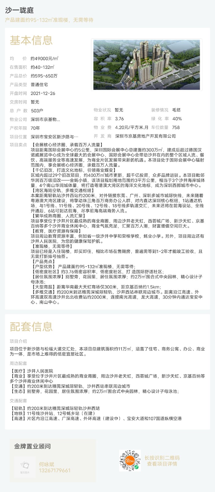 樓盤:沙一瓏庭物業(yè)類型:普通住宅戶型:1室、2室、3室、4室面積:約40-132平米總價:約595-650萬聯系人:何詠斌聯系電話:13267179661
